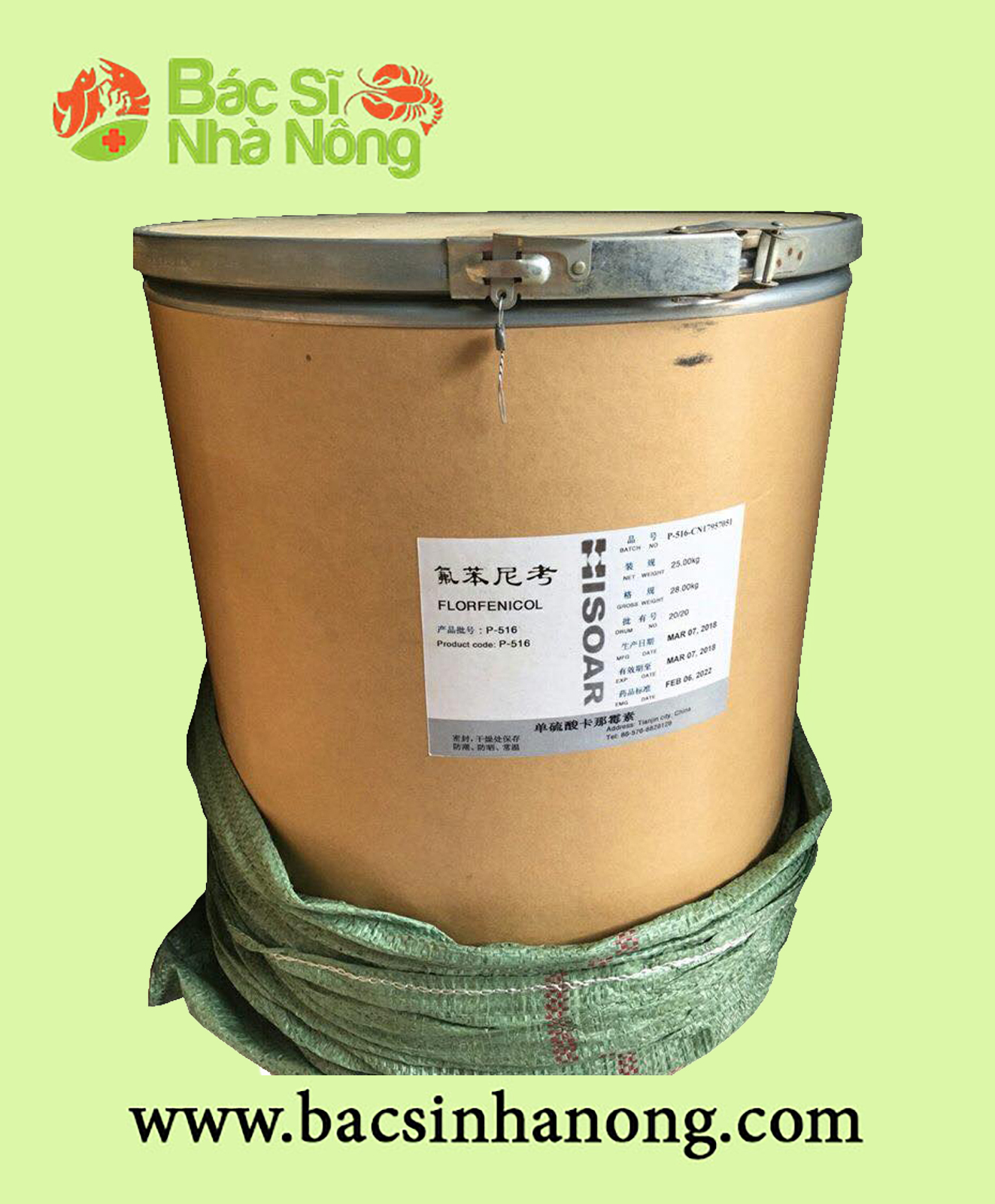 Kháng Sinh Florfenicol nguyên liệu ở dạng bột mịn, có nguồn gốc xuất xứ từ Trung Quốc, và được đóng gói theo quy cách: 25 kg/thùng